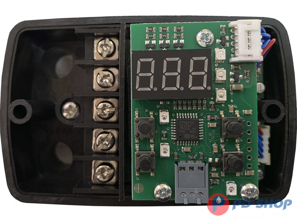 Прибор управляет работой насоса путем старта по заданному давлению от 0,5 до 7,5 бар и останавливает работу насоса по заданному давлению от 1 до 8 бар (выставляется на корпусе кнопками без входа в режим программирования). Пример: запуск насоса - 2 атм., остановка насоса - 3 атм.